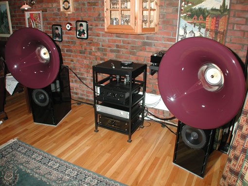 I hooked up the speakers in November 2000. I have a 3W Tube Amp that is feeding the horns, and a 100W Integrated for the Onkens. Active crossover for the bass.